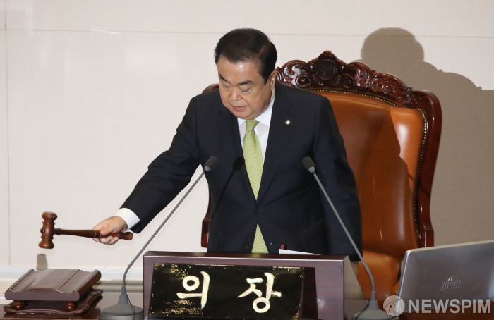 [서울=뉴스핌] 최상수 기자 = 20일 오후 서울 여의도 국회에서 열린 제378회 국회 임시회 본회의에서 문희상 의장이 의사봉을 두드리고 있다. 2020.05.20 kilroy023@newspim.com
