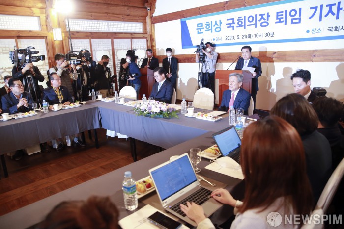 [서울=뉴스핌] 이형석 기자 = 문희상 국회의장이 21일 오전 서울 여의도 국회 사랑재에서 열린 퇴임 기자 간담회에서 소회를 밝히고 있다. 2020.05.21 leehs@newspim.com