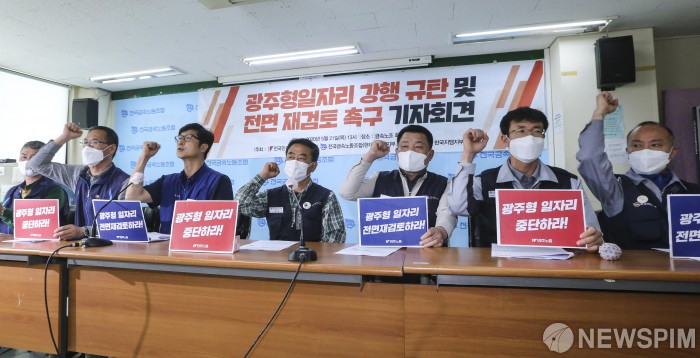 [서울=뉴스핌] 이한결 기자 = 21일 오후 서울 중구 민주노총 전국금속노동조합 회의실에서 열린 ‘광주형 일자리 강행 규탄 및 전면 재검토 촉구 기자회견’에서 참석자들이 구호를 외치고 있다. 이날 기자회견에서는 자동차산업 미래 없는 광주형 일자리 중단을 촉구하고 전면 재검토를 주장했다. 2020.05.21 alwaysame@newspim.com