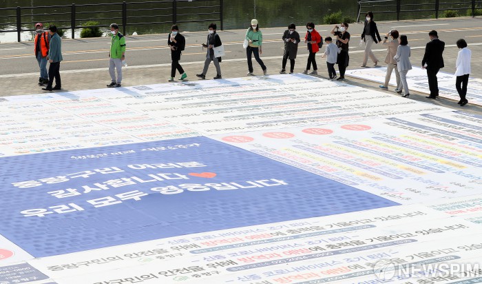 [서울=뉴스핌] 정일구 기자 = 21일 오후 서울 중랑구 중화2동체육공원 제1연육교 인근에서 열린 코로나19 생생기억공간 오픈 기념행사에서 참석자들이 전시를 관람하고 있다. 2020.05.21 mironj19@newspim.com