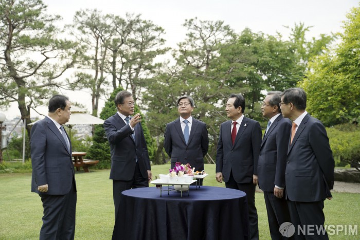 [서울=뉴스핌] 문재인 대통령이 21일 서울 용산구 국회의장 공관에서 문희상 국회의장 초청으로 열린 대통령 및 4부요인 만찬에서 대화를 나누고 있다. [사진=국회] 2020.05.22 photo@newspim.com