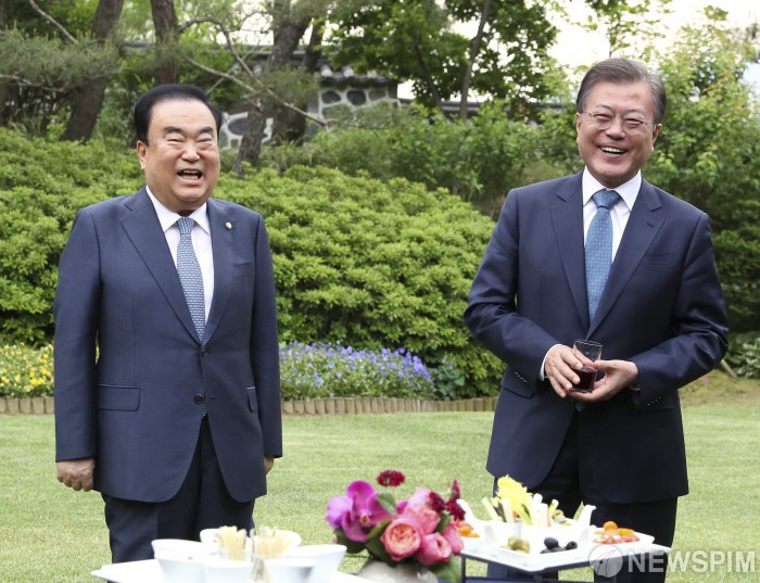 [서울=뉴스핌] 문재인 대통령과 문희상 국회의장이 21일 서울 용산구 국회의장 공관에서 열린 만찬에서 밝은 미소로 대화를 나누고 있다. 이날 만찬에는 4부요인 내외가 함께 참석했다. [사진=국회] 2020.05.22 photo@newspim.com