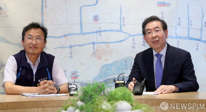 [서울=뉴스핌] 정일구 기자 = 박원순 서울시장(오른쪽)과 김명환 전국민주노동조합총연맹(민주노총) 위원장이 27일 오후 서울 중구 서울시청에서 '코로나19 고용위기 공동대응 간담회'를 갖고 있다. 2020.05.27 mironj19@newspim.com
