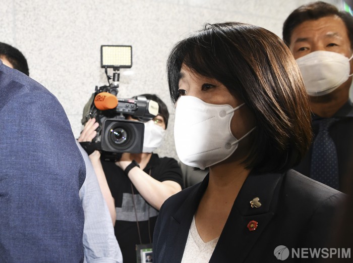 [서울=뉴스핌] 이형석 기자 = 정의기억연대(정의연) 회계 부정 의혹에 휩싸인 윤미향 더불어민주당 당선인이 잠행 열하루 만인 29일 오후 서울 여의도 국회 소통관에서 예정된 기자회견에 참석하기 위해 이동하고 있다. 2020.05.29 leehs@newspim.com