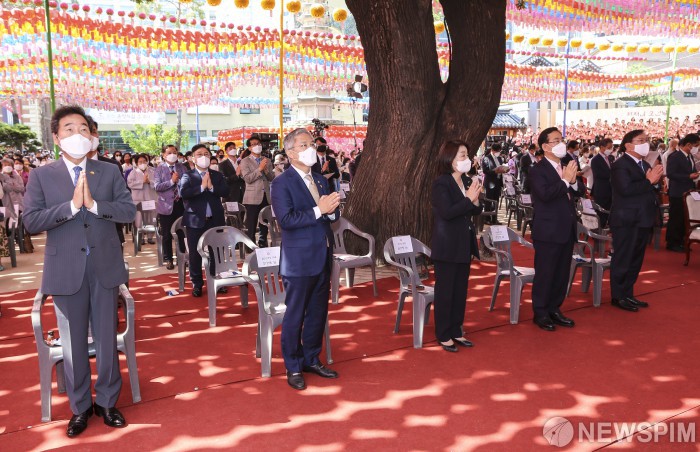 [서울=뉴스핌] 이한결 기자 = 30일 오전 서울 종로구 조계사에서 ‘코로나19 극복과 치유를 위한 기도 회향, 부처님오신날 법요식’이 봉행되고 있다. 이번 봉축법요식은 코로나19로 인해 지난 4월30일로부터 한 달이 연기돼 열렸다. 왼쪽부터 이낙연 더불어민주당 코로나19국난극복위원장, 최강욱 열린민주당 대표, 심상정 정의당 대표, 주호영 미래통합당 원내대표, 김태년 더불어민주당 원내대표. 2020.05.30 alwaysame@newspim.com