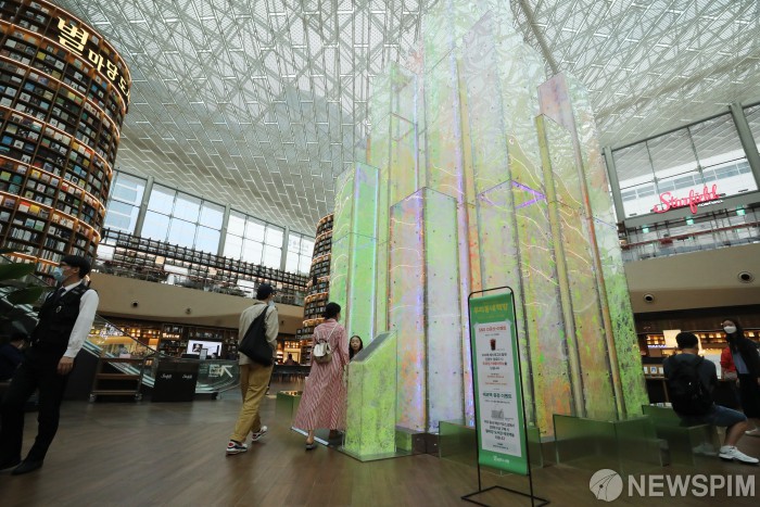 [서울=뉴스핌] 백인혁 기자 = 서울 강남구 스타필드 코엑스몰 별마당 도서관이 개관 3주년을 맞아 새로운 랜드마크로 이은숙, 성병권 작가의 작품 '빛의 도시'를 설치했다. 빛의 도시는 별마당 도서관에 쌓인 지식과 지혜를 도시의 빌딩들로 형상화한 작품이다. 사진은 이날 새로운 랜드마크 '빛의 도시'의 모습. 2020.05.31 dlsgur9757@newspim.com