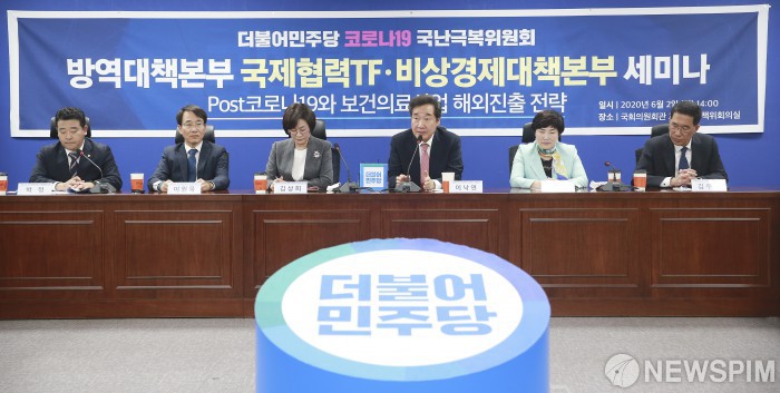 [서울=뉴스핌] 이형석 기자 = 이낙연 코로나19 국난극복위원장이 2일 오후 서울 여의도 국회 의원회관에서 열린 코로나19 국난극복위원회 방역대책본부 국제협력TF-비상경제대책본부 세미나에서 모두발언을 하고 있다. 2020.06.02 leehs@newspim.com