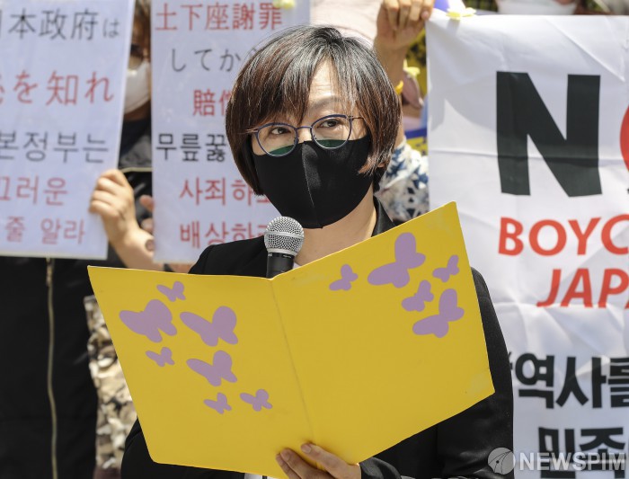 [서울=뉴스핌] 이한결 기자 = 이나영 정의기억연대 이사장이 3일 오후 서울 옛 주한 일본대사관 앞 평화로에서 코로나19 확산 방지를 위해 온라인 집회로 열린 ‘제1442차 일본군성노예제 문제해결을 위한 정기 수요시위’에서 발언을 하고 있다. 2020.06.03 alwaysame@newspim.com