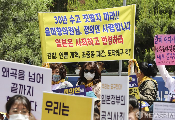 [서울=뉴스핌] 이한결 기자 = 3일 오후 서울 옛 주한 일본대사관 앞 평화로에서 코로나19 확산 방지를 위해 온라인 집회로 열린 ‘제1442차 일본군성노예제 문제해결을 위한 정기 수요시위’에서 참가자들이 손 팻말을 들고 있다. 2020.06.03 alwaysame@newspim.com