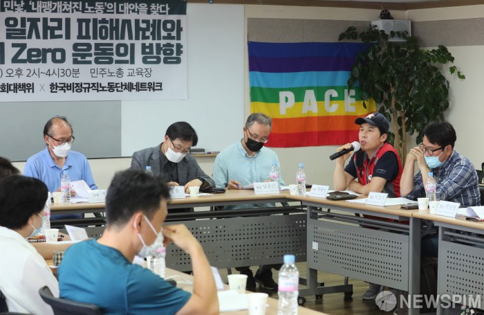 [서울=뉴스핌] 백인혁 기자 = 3일 오후 서울 중구 전국민주노동조합총연맹에서 코로나19 사회경제 위기대응 시민사회대책위원회, 한국비정규직노동단체네트워크 주최로 열린 코로나19로 인한 일자리 피해사례와 사각지대 제로-ZERO운동의 방향 집담회에서 박완규 서울일반노조 제화지부 부지부장이 일자리 피해사례를 종합 발표하고 있다. 이번 집담회는 코로나19 시기 사각지대 노동자들의 긴급 고용생계소득보장 요구방향과 코로나19 이후까지 내다보는 노동권사회안전망 사각지대의 근본적 해소방안에 대하여 논의하기 위해 마련됐다. 2020.06.03 dlsgur9757@newspim.com
