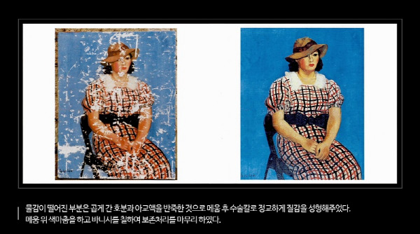 | 이갑경 <격자무늬의 옷을 입은 여인>의 보존 과정을 담은 영상 일부. [사진=국립현대미술관 청주 홈페이지] |