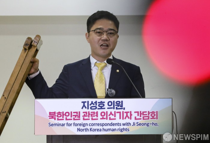 [서울=뉴스핌] 이한결 기자 = 북한 ‘꽃제비’ 출신 탈북자인 지성호 미래통합당 의원이 4일 오전 서울 여의도 국회의원회관 제2소회의실에서 열린 ‘북한인권 관련 외신기자 간담회’에서 발언을 하고 있다. 2020.06.04 alwaysame@newspim.com