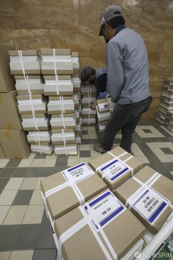 [서울=뉴스핌] 이형석 기자 = 4일 오전 정부가 제출한 3차 추경안 자료가 서울 여의도 국회에 도착해 관계자들이 의안과 앞에 옮기고 있다. 정부는 단일 추경으로 역대 최대 규모인 35조3000억원 규모의 3차 추경안을 국회에 제출했다. 2020.06.04 leehs@newspim.com