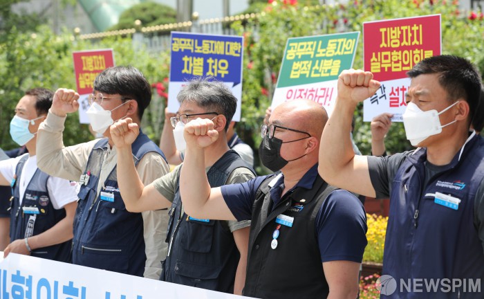 [서울=뉴스핌] 김학선 기자 = 전국자치단체공무직본부가 4일 오후 서울 종로구 세종대로 정부서울청사 앞에서 기자회견을 열고 지방자치 분과협의회 설치를 촉구하고 있다. 2020.06.04 yooksa@newspim.com