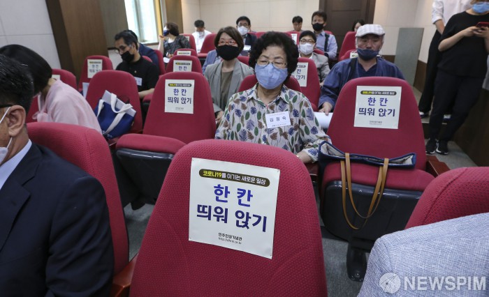 [서울=뉴스핌] 이한결 기자 = 8일 오전 서울 용산구 민주인권기념관에서 열린 제33주년 6월민주항쟁기념행사위원회에 의해 열린 ‘6월민주항쟁 기념주간 선포식’에서 참석자들이 코로나19 확산 방지를 위해 거리를 두고 착석해 있다. 2020.06.08 alwaysame@newspim.com