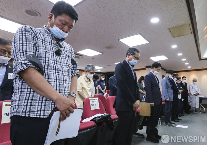 [서울=뉴스핌] 이한결 기자 = 8일 오전 서울 용산구 민주인권기념관에서 열린 제33주년 6월민주항쟁기념행사위원회에 의해 열린 ‘6월민주항쟁 기념주간 선포식’에서 참석자들이 묵념을 하고 있다. 2020.06.08 alwaysame@newspim.com