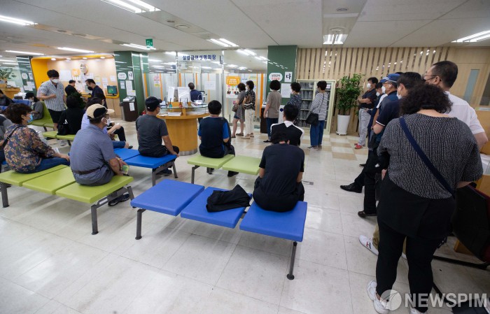 [서울=뉴스핌] 윤창빈 기자 = 10일 오전 서울 중구 서울고용복지플러스센터에서 시민들이 실업급여 신청을 하기 위해 대기하고 있다. 신종 코로나바이러스 감염증(코로나19) 사태로 실업이 확산하면서 지난달 실업급여 지급액은 처음으로 1조원을 넘어섰다. 2020.06.10 pangbin@newspim.com