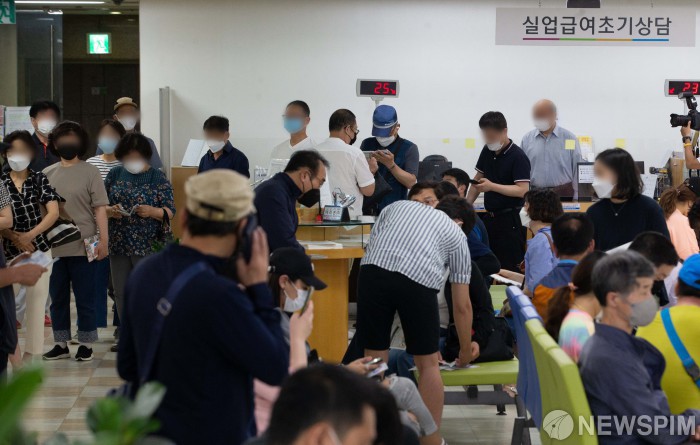 [서울=뉴스핌] 윤창빈 기자 = 10일 오전 서울 중구 서울고용복지플러스센터에서 시민들이 실업급여 신청을 하기 위해 대기하고 있다. 신종 코로나바이러스 감염증(코로나19) 사태로 실업이 확산하면서 지난달 실업급여 지급액은 처음으로 1조원을 넘어섰다. 2020.06.10 pangbin@newspim.com