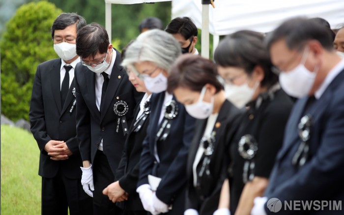 [서울=뉴스핌] 정일구 기자 = 10일 오전 서울 동작구 국립서울현충원에서 열린 고(故) 이희호 여사 1주기 추도식에서 김홍업 김대중평화센터 이사장(왼쪽부터)과 김홍걸 더불어민주당 의원 등 참석자들이 고인에 대한 묵념을 하고 있다. 2020.06.10 mironj19@newspim.com