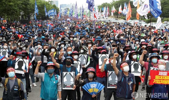 [서울=뉴스핌] 정일구 기자 = 10일 오후 서울 영등포구 여의도공원 인근에서 열린 중대재해기업처벌법 우선 입법 촉구 민주노총 결의대회에서 참가자들이 구호를 외치고 있다. 2020.06.10 mironj19@newspim.com