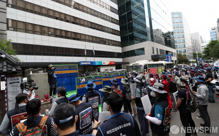[서울=뉴스핌] 정일구 기자 = 김명환 위원장 등 참가자들이 10일 오후 서울 영등포구 여의도공원 인근에서 열린 중대재해기업처벌법 우선 입법 촉구 민주노총 결의대회를 마치고 더불어민주당 당사에 집결하고 있다. 2020.06.10 mironj19@newspim.com