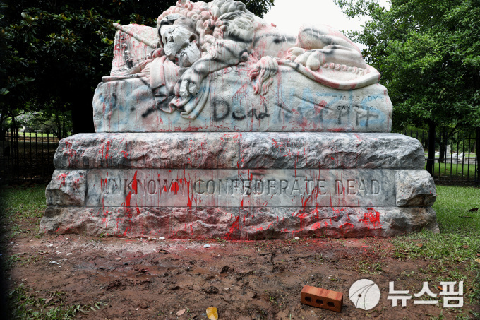 | [애틀랜타 로이터=뉴스핌] 최원진 기자= 미국 조지아주 애틀랜타에 위치한 오클랜드 묘지에 있는 무명 남부연합군 기념비가 흑인사망 항의 시위대에 의해 훼손돼 있다. 남부연합은 미 남북전쟁 때 노예제를 고수하며 합중국을 탈퇴한 남부 11주가 결성한 국가(1861∼1865)다. 백인 우월주의와 인종차별의 상징이어서 흑인사망 시위대의 표적이 되고 있다. 2020.06.10 wonjc6@newspim.com |