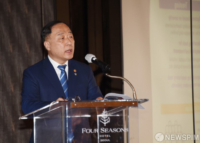 [서울=뉴스핌] 홍남기 부총리 겸 기획재정부 장관이 11일 서울 광화문 포시즌스 호텔에서 열린 '주한 EU대사단 오찬간담회'에서 'K-방역 성공요인과 코로나19 대응 경제정책'을 주제로 강연을 하고 있다.[사진=기획재정부] 2020.06.11 photo@newspim.com