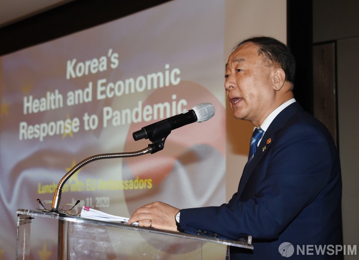 [서울=뉴스핌] 홍남기 부총리 겸 기획재정부 장관이 11일 서울 광화문 포시즌스 호텔에서 열린 '주한 EU대사단 오찬간담회'에서 'K-방역 성공요인과 코로나19 대응 경제정책'을 주제로 강연을 하고 있다.[사진=기획재정부] 2020.06.11 photo@newspim.com