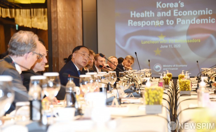 [서울=뉴스핌] 홍남기 부총리 겸 기획재정부 장관이 11일 서울 광화문 포시즌스 호텔에서 열린 '주한 EU대사단 오찬간담회'에서 인사말을 하고 있다.[사진=기획재정부] 2020.06.11 photo@newspim.com