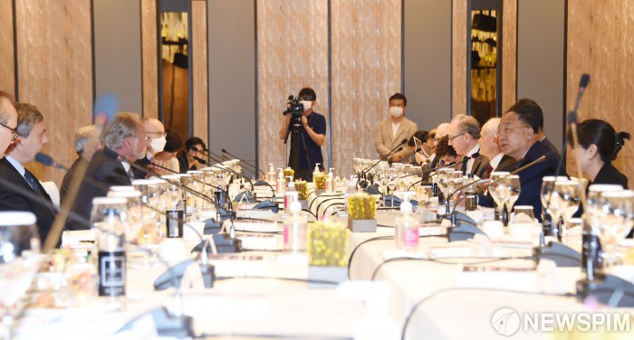 [서울=뉴스핌] 홍남기 부총리 겸 기획재정부 장관이 11일 서울 광화문 포시즌스 호텔에서 열린 '주한 EU대사단 오찬간담회'에서 인사말을 하고 있다.[사진=기획재정부] 2020.06.11 photo@newspim.com