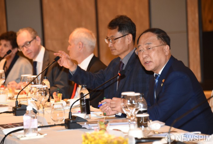 [서울=뉴스핌] 홍남기 부총리 겸 기획재정부 장관이 11일 서울 광화문 포시즌스 호텔에서 열린 '주한 EU대사단 오찬간담회'에서 인사말을 하고 있다.[사진=기획재정부] 2020.06.11 photo@newspim.com