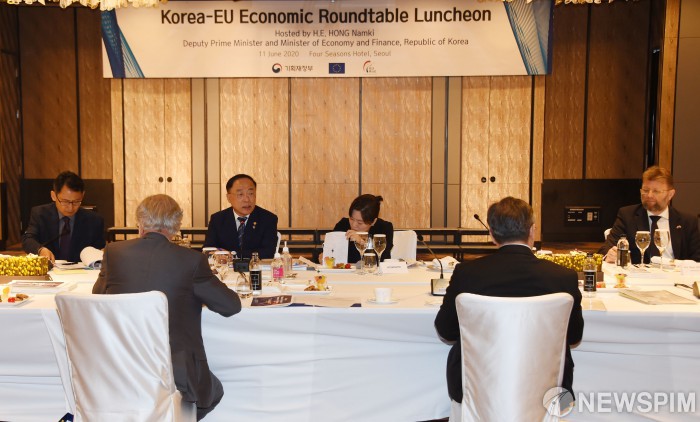 [서울=뉴스핌] 홍남기 부총리 겸 기획재정부 장관이 11일 서울 광화문 포시즌스 호텔에서 열린 '주한 EU대사단 오찬간담회'에서 인사말을 하고 있다.[사진=기획재정부] 2020.06.11 photo@newspim.com