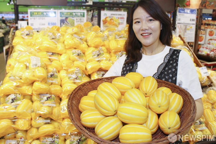 [서울=뉴스핌] 롯데마트가 11일 오전 서울역점에서 '농가돕기 성주 참외'를 소개하고 있다. 롯데마트는 오늘 부터 17일까지 전국 모든 점포에서 '농가돕기 성주 참외'를 1만1980원에 판매한다. [사진=롯데마트] 2020.06.11 photo@newspim.com
