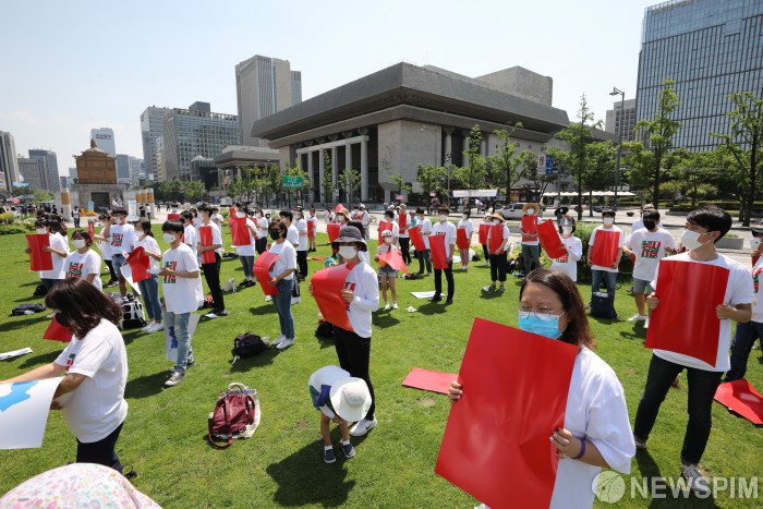 [서울=뉴스핌] 백인혁 기자 = 서울겨레하나 회원들이 13일 오후 서울 종로구 광화문광장에서 열린 '6.15공동선언 발표 20주년 기자회견'에서 미 대사관을 향해 레드카드 퍼포먼스를 하고 있다. 2020.06.13 dlsgur9757@newspim.com