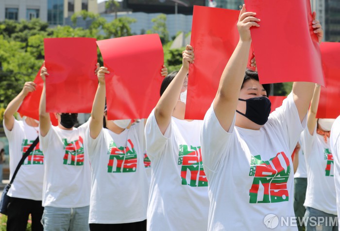 [서울=뉴스핌] 백인혁 기자 = 서울겨레하나 회원들이 13일 오후 서울 종로구 광화문광장에서 열린 '6.15공동선언 발표 20주년 기자회견'에서 미 대사관을 향해 레드카드 퍼포먼스를 하고 있다. 2020.06.13 dlsgur9757@newspim.com