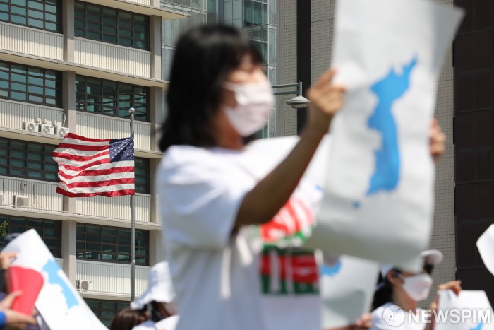 미 대사관 향해 한반도기 들어보이는 서울겨레하나
