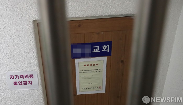 [인천=뉴스핌] 김학선 기자 = 인천, 경기 등 수도권 개척교회와 관련해 신종 코로나바이러스 감염증(코로나19) 누적 확진자가 100명을 넘어서며 확산하는 가운데 14일 오전 확진자가 발생한 인천시 부평구의 모 교회 출입문에 폐쇄명령서가 붙어 있다. 2020.06.14 yooksa@newspim.com
