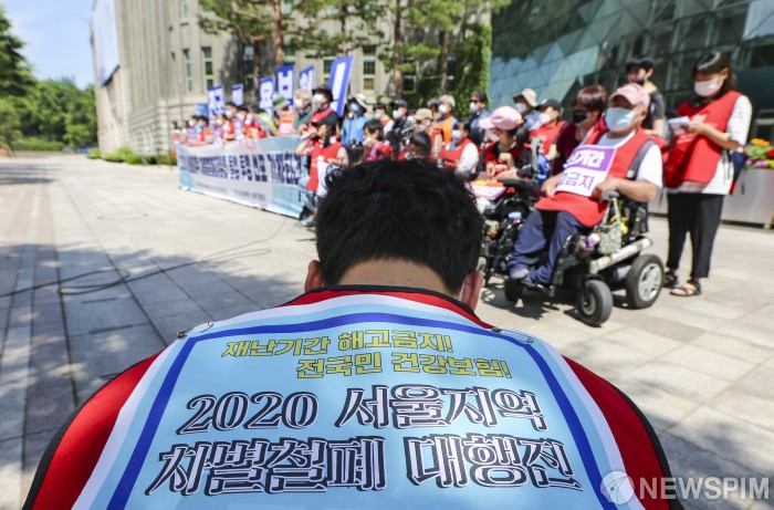 [서울=뉴스핌] 이한결 기자 = 15일 오전 서울 중구 서울특별시청 앞에서 열린 ‘2020 서울지역 차별철폐대행진 돌입 투쟁 선포 기자회견’에서 참석자들이 손 팻말을 들고 있다. 2020.06.15 alwaysame@newspim.com