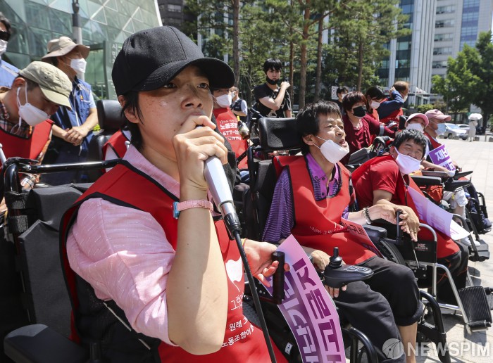 [서울=뉴스핌] 이한결 기자 = 문애린 서울장애인차별철폐연대 상임대표가 15일 오전 서울 중구 서울특별시청 앞에서 열린 ‘2020 서울지역 차별철폐대행진 돌입 투쟁 선포 기자회견’에서 발언을 하고 있다. 2020.06.15 alwaysame@newspim.com
