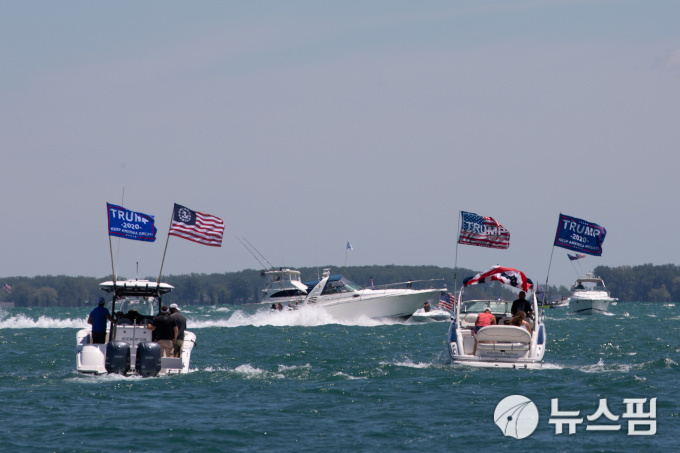 | [해리슨타운쉽 로이터=뉴스핌] 박우진 기자 = 13일(현지시간) 미국 미시간주 해리슨타운쉽에 있는 세인트클레어호에서 트럼프 대통령 지지자들이 그의 생일을 맞아 '미국을 다시 위대하게'를 주제로 보트 퍼레이드를 펼치고 있다. 2020.06.13 krawjp@newspim.com |
