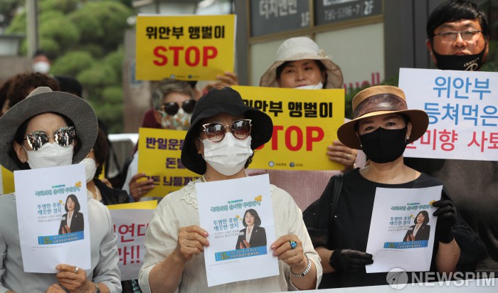 [서울=뉴스핌] 김학선 기자 = 17일 오후 서울 종로구 옛 일본대사관 앞에서 제1444차 일본군 성노예제 문제해결을 위한 정기 수요시위가 진행중인 가운데 바로 옆에서 수요시위 주최인 정의기억연대와 윤미향 의원을 규탄하는 집회가 열리고 있다. 2020.06.17 yooksa@newspim.com