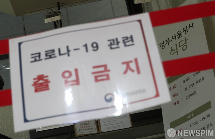 [서울=뉴스핌] 김학선 기자 = 19일 오전 서울 종로구 정부서울청사 본청 구내식당이 코로나19 확진자 방문으로 임시 폐쇄되어 있다. 행정안전부 정부청사관리본부 서울청사관리소와 서울 종로구에 따르면 경기 화성시에 거주자인 50대 남성 A씨는 지난 12일 오전 정부청사 본관 구내식당에 기계 설치를 위해 방문했다. 이후 먼저 나온 확진자의 밀접접촉자로 분류돼 검체 검사를 받았고 18일 양성 판정을 받았다. 2020.06.19 yooksa@newspim.com