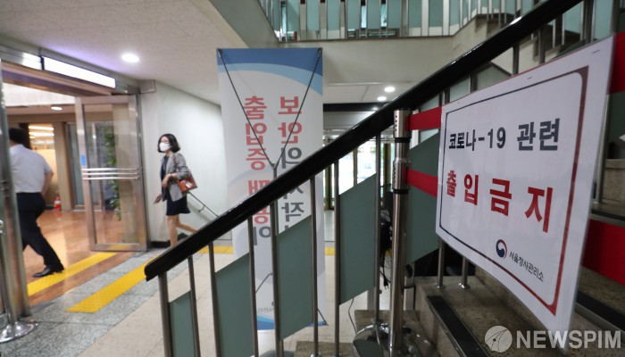 [서울=뉴스핌] 김학선 기자 = 19일 오전 서울 종로구 정부서울청사 본청 구내식당이 코로나19 확진자 방문으로 임시 폐쇄되어 있다. 행정안전부 정부청사관리본부 서울청사관리소와 서울 종로구에 따르면 경기 화성시에 거주자인 50대 남성 A씨는 지난 12일 오전 정부청사 본관 구내식당에 기계 설치를 위해 방문했다. 이후 먼저 나온 확진자의 밀접접촉자로 분류돼 검체 검사를 받았고 18일 양성 판정을 받았다. 2020.06.19 yooksa@newspim.com