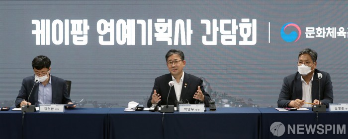 [서울=뉴스핌] 이현경 기자 = 박양우 문화체육관광부 장관이 19일 서울 중구 콘텐츠코리아랩(CKL)에서 열린 케이팝 연예기획사 간담회에 참석해 인사말을 하고 있다. [사진=문체부] 2020.06.19 89hklee@newspim.com