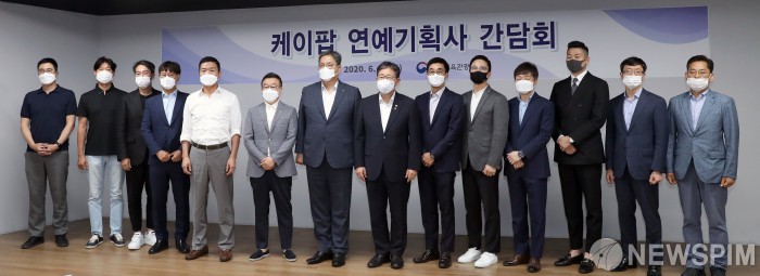[서울=뉴스핌] 이현경 기자 = 박양우 문화체육관광부 장관이 19일 서울 중구 콘텐츠코리아랩(CKL)에서 열린 케이팝 연예기획사 간담회에 참석한 기획사 대표와 기념촬영을 하고 있다. [사진=문체부] 2020.06.19 89hklee@newspim.com