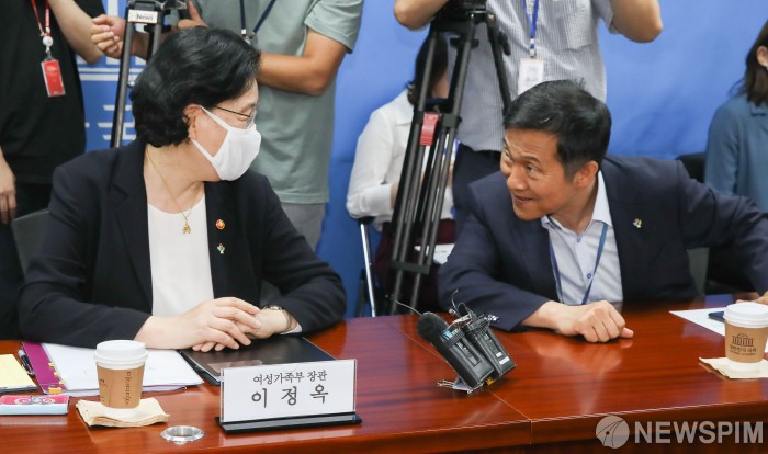 [서울=뉴스핌] 최상수 기자 = 이정옥 여성가족부 장관, 김연명 청와대 사회수석이 22일 오전 서울 여의도 국회의원회관에서 열린 더불어민주당 여성가족위원회 당정청협의회에서 대화를 나누고 있다. 2020.06.22 kilroy023@newspim.com