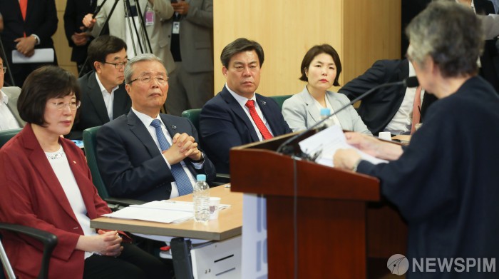 [서울=뉴스핌] 최상수 기자 = 김종인 미래통합당 비상대책위원장이 22일 오전 서울 여의도 국회의원회관에서 열린 6.25전쟁 70주년 기념토론회에 참석하고 있다. 왼쪽부터 정경희 의원, 김 비대위원장, 김선동, 전희경 의원. 2020.06.22 kilroy023@newspim.com