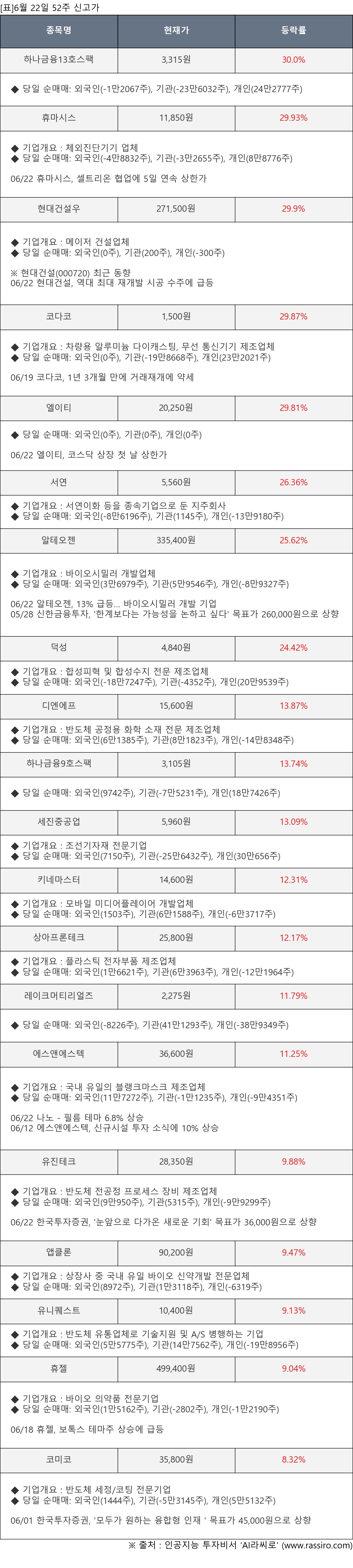 ※ 관련 종목: 하나금융13호스팩, 휴마시스, 현대건설우, 코다코, 엘이티, 서연, 알테오젠, 덕성, 디엔에프, 하나금융9호스팩, 세진중공업, 키네마스터, 상아프론테크, 레이크머티리얼즈, 에스앤에스텍, 유진테크, 앱클론, 유니퀘스트, 휴젤, 코미코