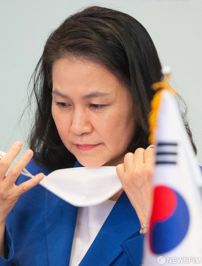 [서울=뉴스핌] 윤창빈 기자 = 유명희 산업통상자원부 통상교섭본부장이 23일 오전 서울 강남구 코엑스에서 열린 지역포괄적경제동반자협정(RCEP) 장관회의에서 마스크를 벗고 있다. 2020.06.23 pangbin@newspim.com