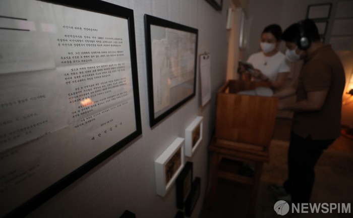 [서울=뉴스핌] 백인혁 기자 = 23일 오후 서울 종로구 국립현대미술관에서 한국전쟁 70년 '낯선 전쟁'전 언론간담회 참석자들이 한석경의 '시언, 시대의 언어'를 둘러보고 있다. 이번 전시는 한국전쟁으로 인한 피해와 상처를 극복하고, 전쟁을 비롯 코로나19 등 전 지구적 재난속에서 미술을 통한 치유와 평화의 비전을 제시하고자 마련된 대규모 기획전이다. 2020.06.23 dlsgur9757@newspim.com